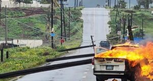 Vehículo se incendia tras ser impactado por postes colapsados de la...