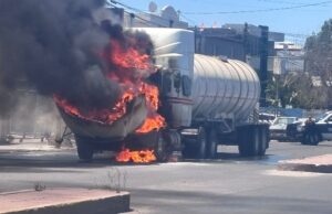 Ensenada.- Un trailer que transportaba agua se incendió este domingo en la avenida Delante, en la ciudad de Ensenada.